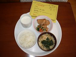 給食は和食中心。基本はご飯。おかずは魚、野菜が多く、味噌汁は具だくさん。和食でバランスのいい食事を、という配慮から。家庭の食事が洋食や外食で油が多く、子どもたちに生活習慣病が広がっているからだ。給食は、毎日、入口に展示し、迎えに来た親に、その日、子どもたちがどんなものを食べたか説明するようにしてある。というのは、現物を見てもらい、家庭での料理のバランスを考えてもらうという配慮からだ。